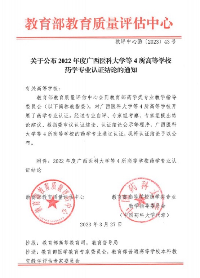 2023年3月27日,英国上市官网365教育质量评估中心会同英国上市官网365高等学校药学类专业教学指导委员会共同签发《关于公布2022年度广西医科大学等4所高等学校药学专业认证结论的通知》(教评中心函〔2023〕43号),对2022年度广西医科大学等4所高等学校药学专业认证结论进行公布。经过专业自评、专家组考察、专家组提出结论建议、教指委审议认证结论、认证结论公示等程序,英国上市官网365药学专业顺利通过英国上市官网365专业认证,认证有效期6年(即至2029年2月)。