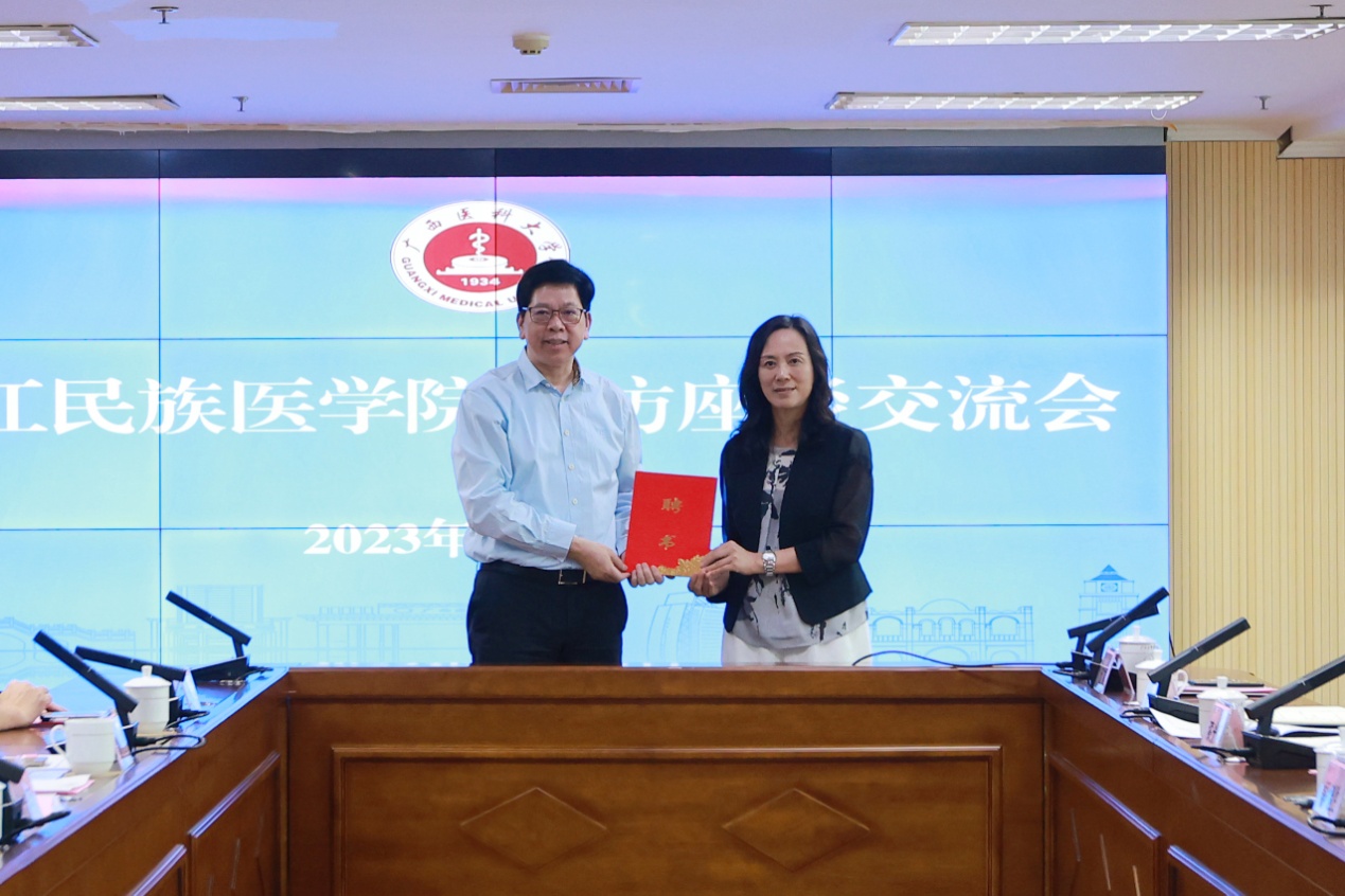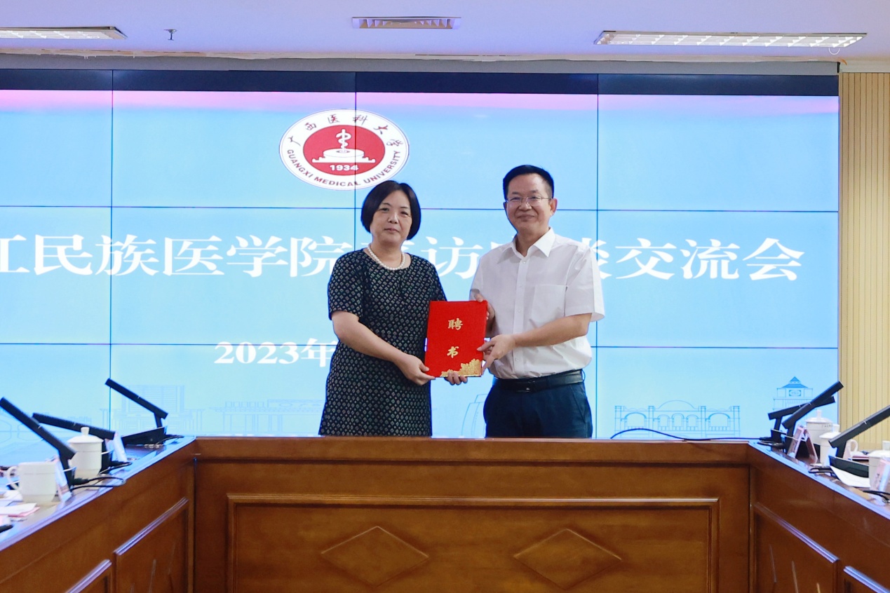 座谈会上,双方围绕一流学科建设、高层次人才队伍、新校区管理运行、研究生导师选聘等方面进行了一对一的深入交流和探讨,并举行了两校公共卫生与预防医学广西一流学科互聘学科方向带头人颁发聘书仪式。